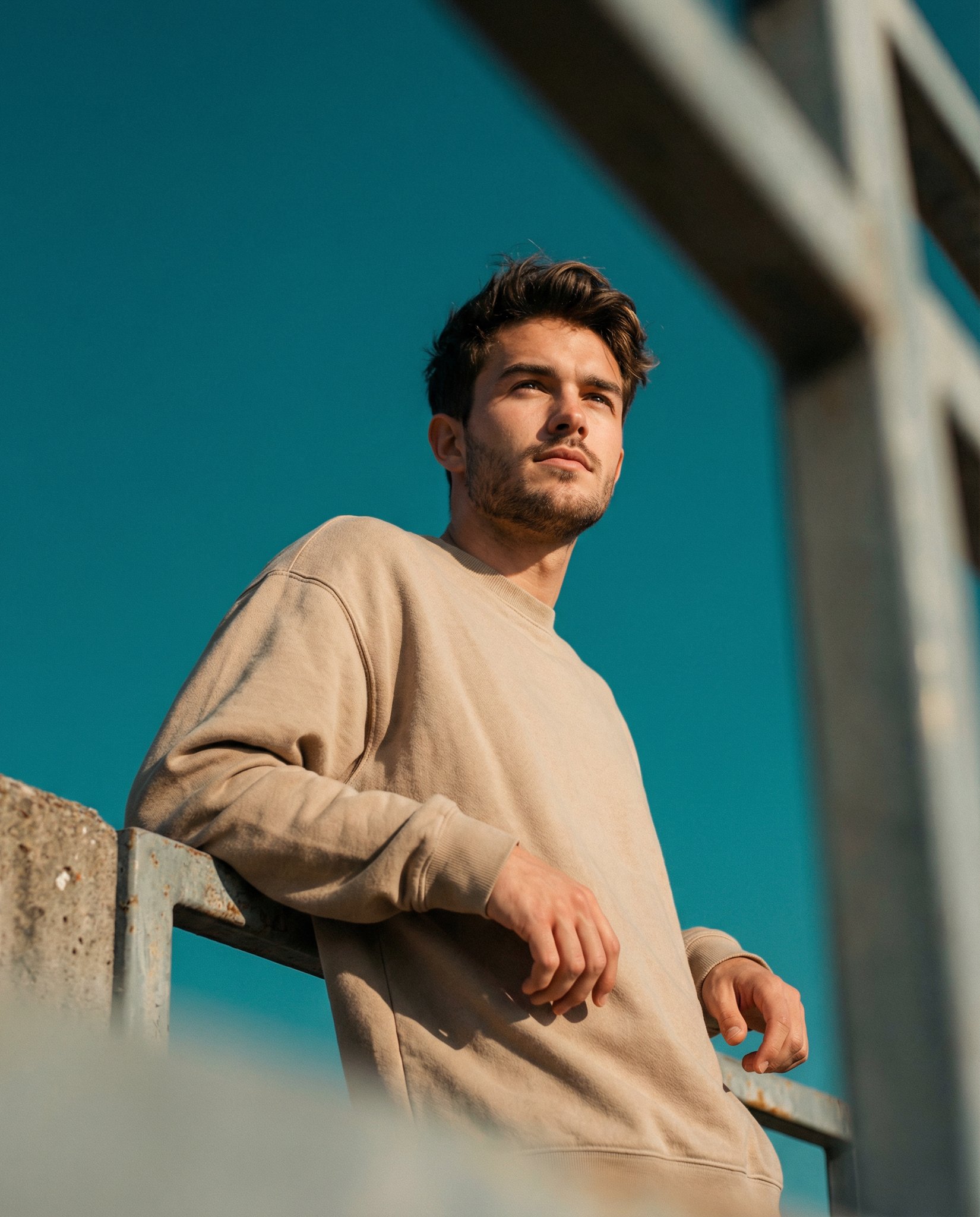 Nano Banana 2 on @PixPrettyAI Prompt: A cinematic low-angle portrait shot on a 50mm lens, looking upward at a male subject using the uploaded face as reference. He leans casually against a weathered concrete and metal railing, resting both elbows. The subject has short dark hair with subtle sun-kissed highlights and light natural texture, with a slightly tousled appearance. He wears an oversized, textured beige long-sleeve crewneck sweatshirt with a relaxed, loose drape. He gazes upward to the right with a calm, introspective expression, conveying quiet confidence and contemplation. Soft, warm natural sunlight illuminates the scene, casting gentle shadows along the jawline and emphasizing facial structure with realistic skin subsurface scattering. A strong foreground bokeh from a structural element on the right adds depth and framing. The background is a vast, solid deep teal-cyan sky, creating a cinematic teal-and-orange analog film color grade, with subtle film grain and natural contrast.