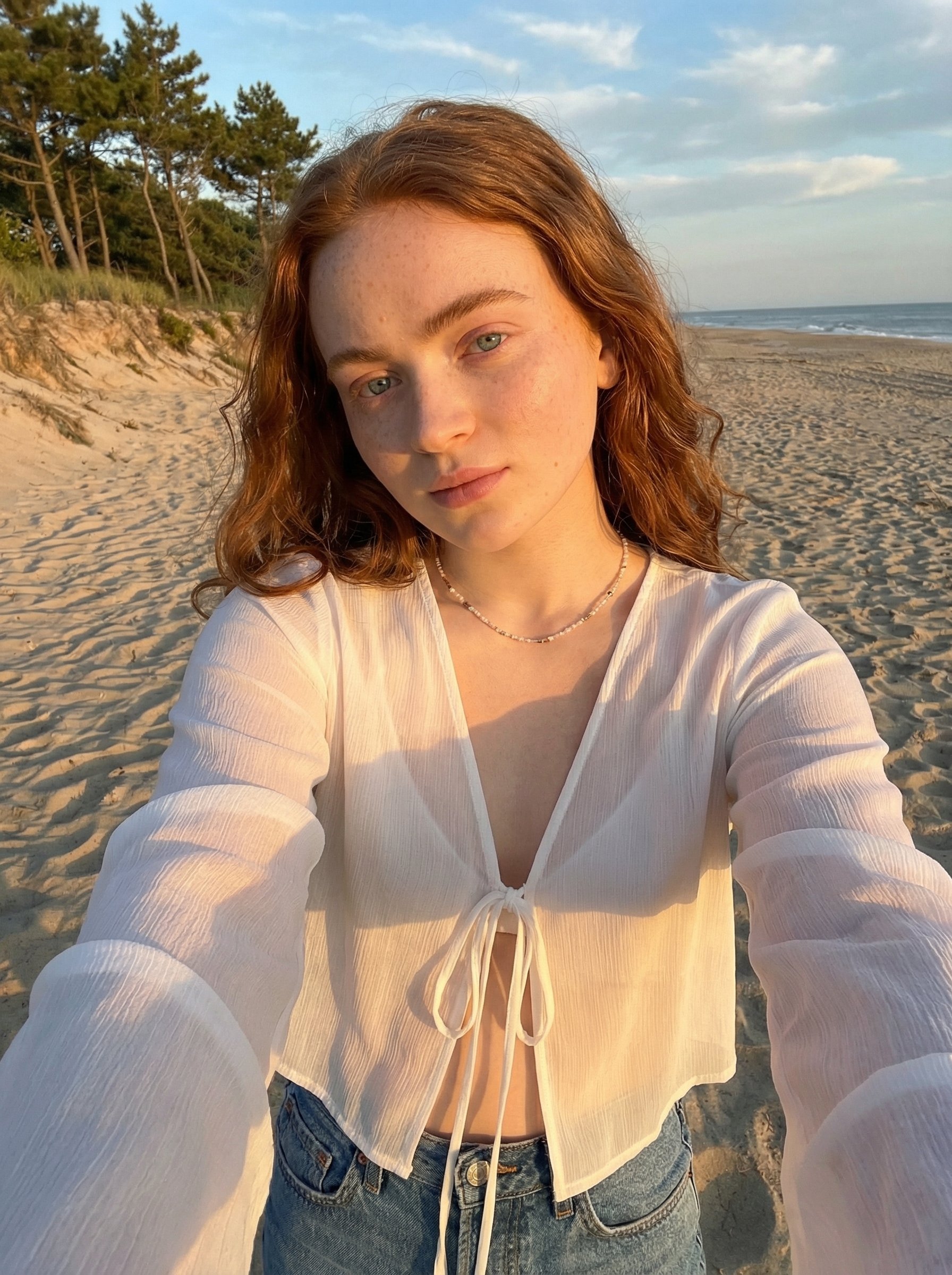 Use a clean reference image with obvious subject edges and readable facial or product details before you start changing the styling. Keep the generator on 3:4 for the closest match. The mood is anchored by { "scene": { "setting": "outdoor beach environment during golden hour", "background": "warm sandy beach...
