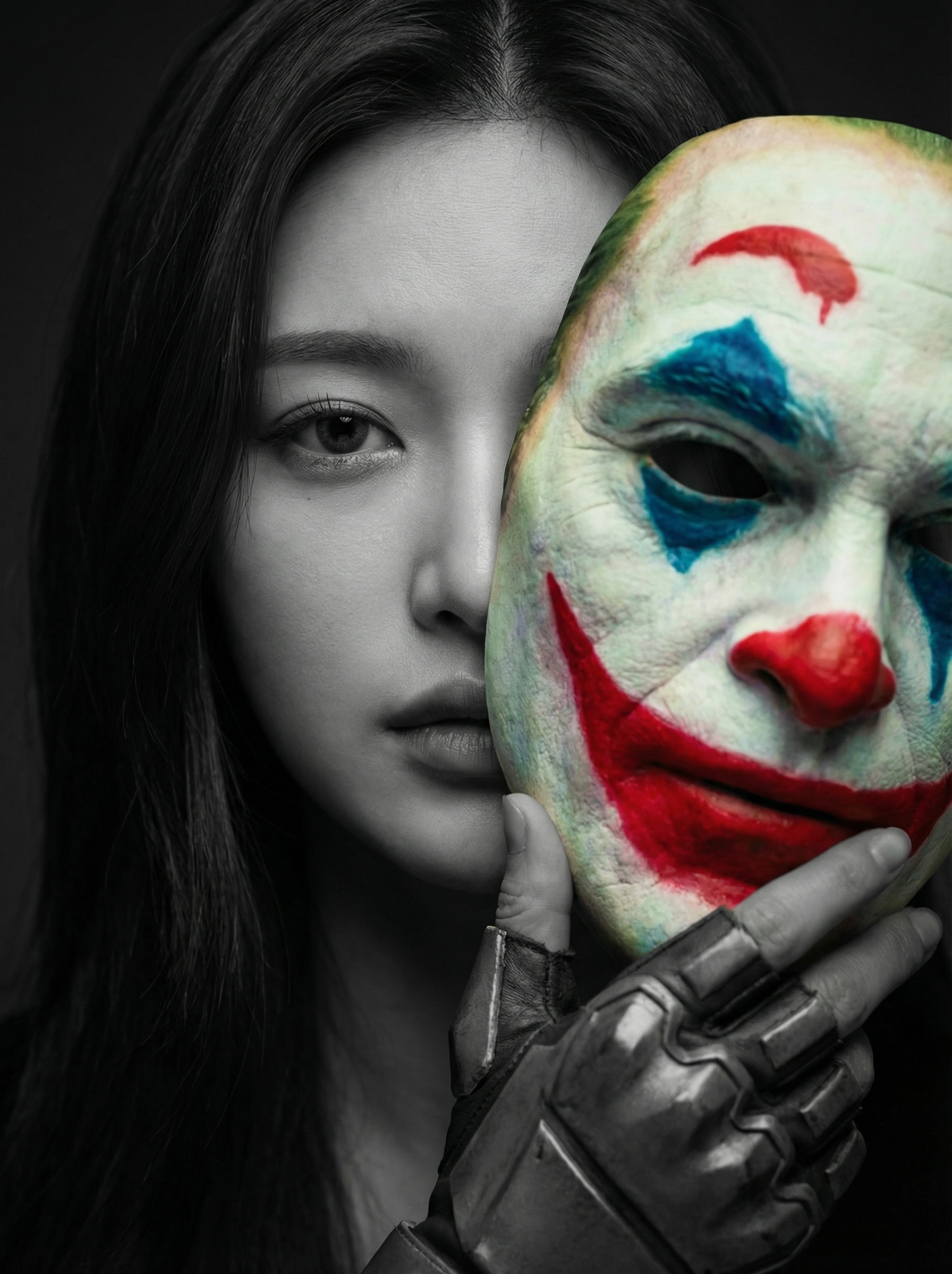 { "type": "image_generation_prompt", "style": "cinematic, symbolic, high-contrast, artistic portrait", "theme": "duality and hidden identity", "identity_preservation": { "use_reference_image": true, "alter_face": false, "strict_identity_lock": true, "notes": "Use the uploaded reference image as a 100% faithful source. Preserve the woman’s exact facial features, proportions, skin texture, and natural appearance without any modification." }, "subject": { "gender": "female", "appearance": { "color_treatment": "grayscale", "expression": "thoughtful, melancholic, introspective", "visible_eye": "expressive and emotional, conveying inner conflict" }, "pose": { "action": "holding a Joker-style clown mask in front of part of her face", "hand": { "detail": "highly detailed hand, possibly gloved or armored", "color_treatment": "grayscale" } } }, "mask": { "type": "Joker-style clown mask", "color": "full vibrant color", "details": { "smile": "bright red exaggerated smile", "nose": "red clown nose", "eye_markings": "blue markings around the eyes" }, "symbolism": "cheerful, unsettling facade masking a darker inner reality" }, "environment": { "background": { "style": "dark and minimalistic", "purpose": "to emphasize contrast between the grayscale subject and the colorful mask" } }, "lighting": { "style": "dramatic, cinematic", "effects": [ "strong contrast between light and shadow", "focused illumination on face, eye, and mask", "subtle falloff into darkness" ] }, "color_contrast": { "subject": "entirely grayscale", "mask": "fully saturated vivid colors", "intent": "visual metaphor of duality, identity, and emotional conflict" }, "mood": { "atmosphere": "dark, psychological, introspective", "tone": "mysterious, symbolic, emotionally charged" }, "quality": { "realism": "highly photorealistic", "detail_level": "ultra-detailed skin, mask texture, and hand realism", "rendering": "cinematic and artistic" }, "output_goal": "Create a striking, ultra-realistic cinematic portrait of a woman expressing duality and hidden identity, using a vivid Joker-style mask contrasted against a grayscale, emotionally subdued reality, while preserving her exact facial identity." }