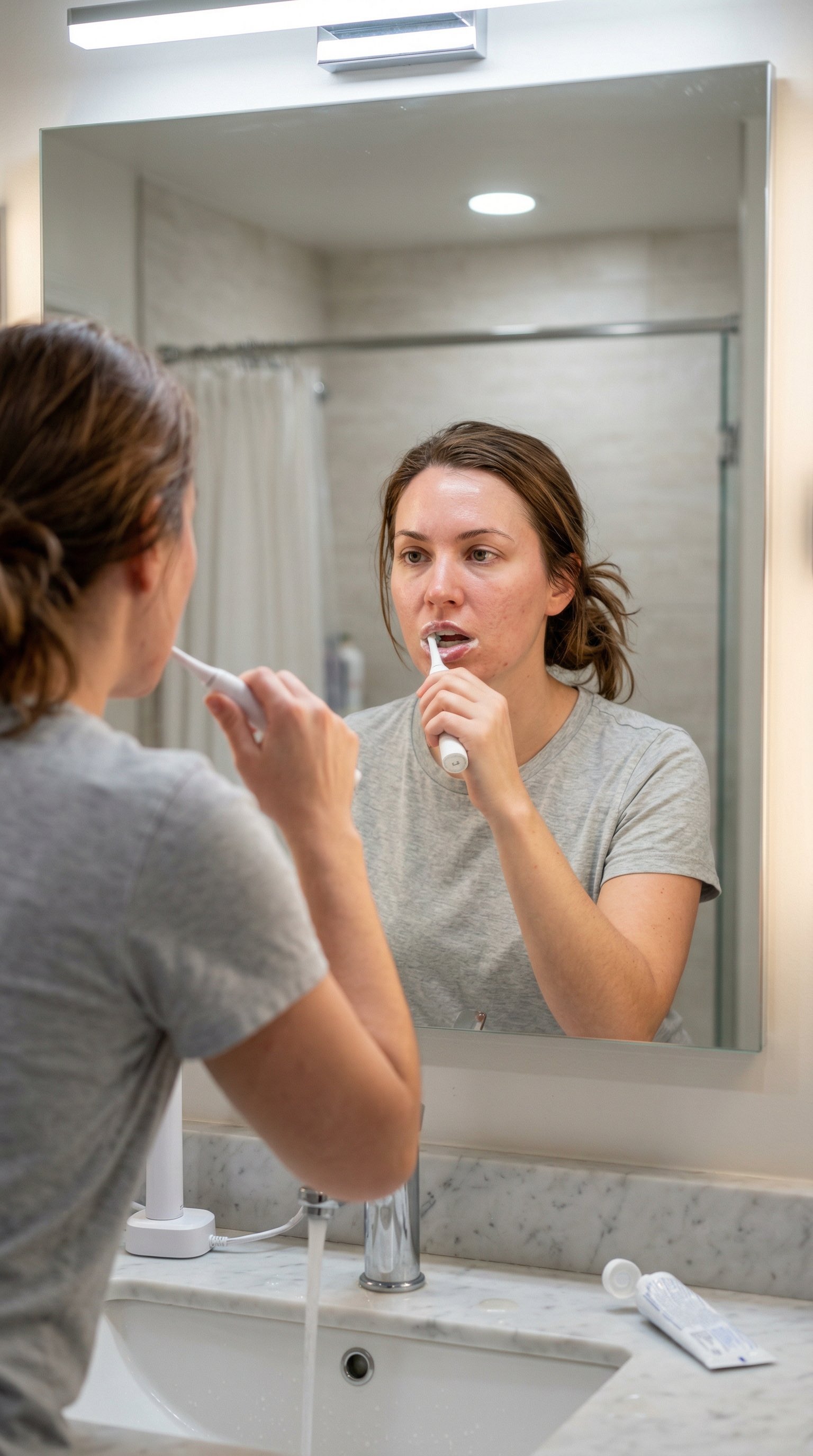 Use a clean reference image with obvious subject edges and readable facial or product details before you start changing the styling. Keep the generator on 9:16 for the closest match. The mood is anchored by bright even bathroom lighting from overhead led fixtures (cool-white 4000-5000k) plus soft warm vanity lights...