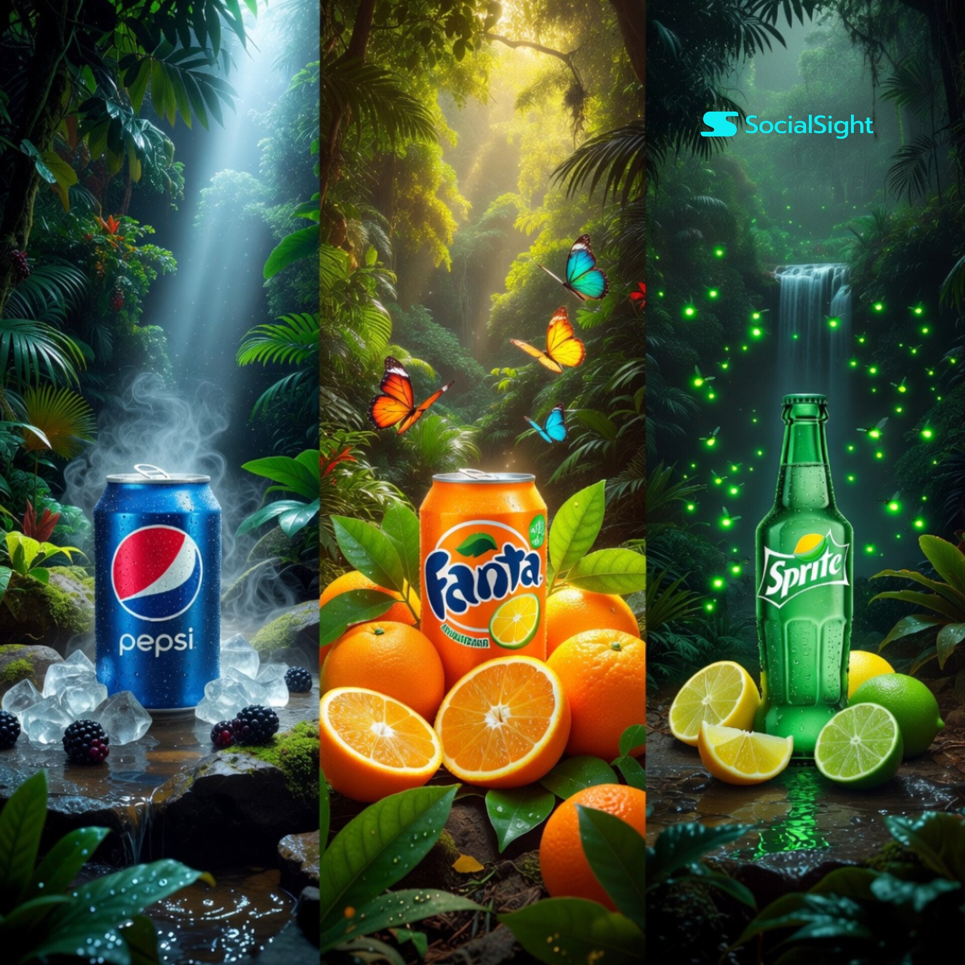 Lock the environment before fine styling changes: Prompt 👇 Ultra-realistic cinematic collage of three iconic soft drink products placed in a lush tropical...