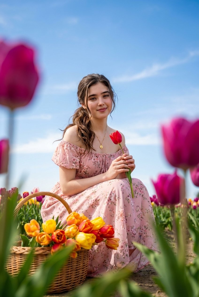 - ✓Change the subject block first: A cheerful brunette woman in a soft pink off-shoulder floral midi dress is crouching in a vibrant tulip field.